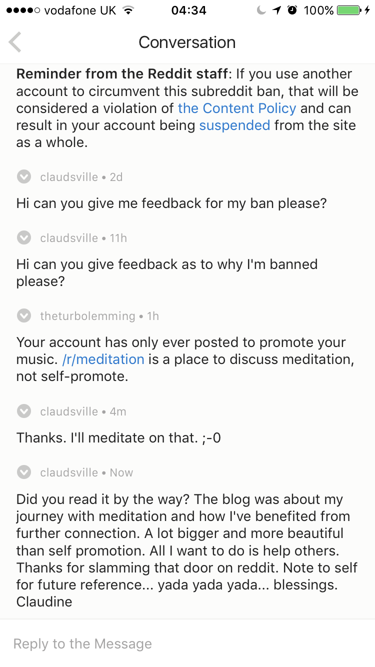 Then after a wonderful Loreena McKennitt concert in Gateshead, at The Sage. I return to the hotel to check some bits. Then a bitch slap. After the high comes the low. Thinking ooh my 2 busy weeks. Sharing my stuff on difference platforms… then …… In all of my enthusiasm and excitement… I failed to read the instructions..  Jesus Wept! Measure twice, cut once. Always encouraging to get blocked by a ‘moderator’ on #Reddit for sharing the #meditation and connection that lead to me to creating & sharing music for others. Why thank you #theturbolemming #perseverance #sharethelove #Reddit #ego #slappedwrist #dulynoted  oh and Turbo Lemming person. Please don’t be a future fan, I’m asking you. Not instantly blocking you 😉  I’m only human after all. Don’t put the blame on me… I am unable to contribute to meditation discussion now! But thanks. You inspired me further.. and we’re the inspiration for this blog. Blessings…. oh and Turbo Lemming my little sausage… seeing as you will not promote me. I had to do it myself darling. I’ve sent the link to this blog to you in Reddit. 😉 xxx is this you by the way? https://youtu.be/8xCwNWTVBLM